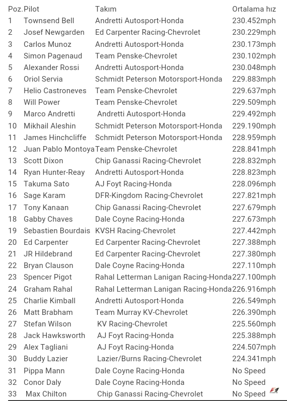227 mil/saat'lik yetersiz bir performans sergileyen Tony Kaan'ın ardından bu yıl IndyCar'ı domine eden Simon Pagenaud üç turluk stintini attı ve 230.102 mil/saat'lik ortalama ile zirveye yerleşti.