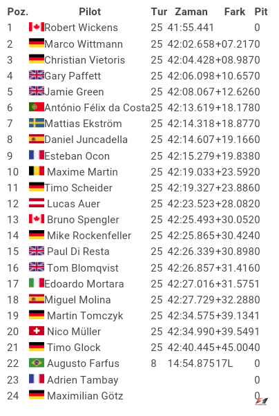 BMW pilotu Marco Wittmann son turlara kadar arkasındaki Mercedes pilotu Christian Vietoris'e karşı iyi bir savunma yaptı ve podyumun ikinci basamağının sahibi oldu.