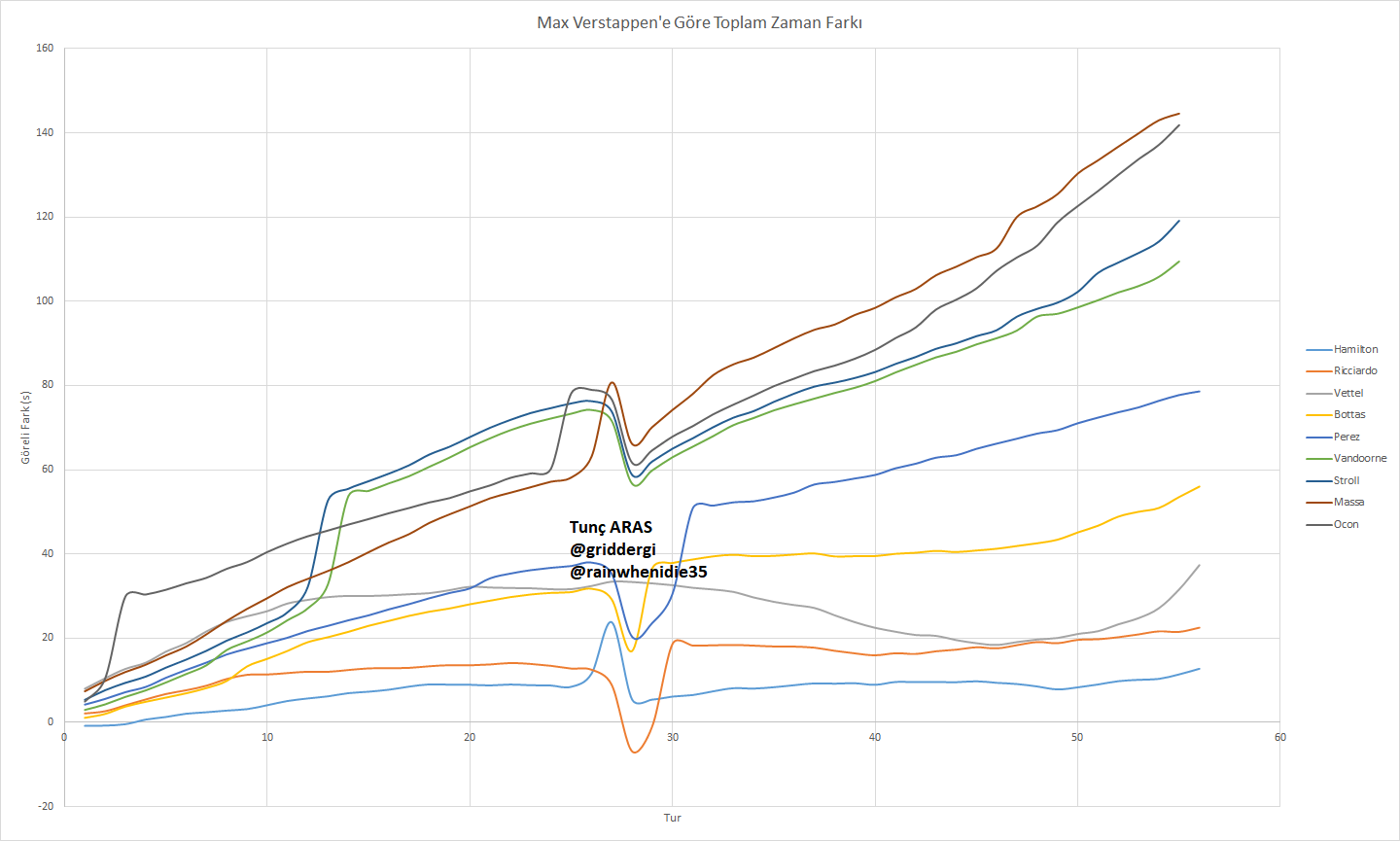 Takımlar analizine geçmeden önce İtalya Grand Prix’inde paylaştığım gibi ilk 10’a giren pilotların lidere olan saniye bazındaki tur farklarını paylaşmak isterim. Gördüğünüz gibi Hamilton ikinciliğe düşmenin ardından 20. turlarda rakibiyle olan farkı ortalama 10 saniye olarak turuyor. Kendisinin pit çıkışı hızlı turları ve 49. turda arabayı keşfetmek için hızlanması dışında bu fark korunuyor. Ricciardo Bottas’ı geçmenin ardından pitine kadar Hamilton gibi davranıyor ama Vettel’in hızlandığı kendisine duyurulunca temposunu 40. tura kadar arttırmaya çalışıyor. 46. turda aralarında bir saniyeden az zaman farkı olmasına rağmen (ki Ferrari bölümünde atağını da göstereceğiz.) Vettel geçemeyeceğini anlayınca gazdan ayağını çekiyor ve Ricciardo da biraz ihtiyatlı şekilde damalı bayrağı geçiyor. Bottas Verstappen’le arasındaki farkı sadece yarışın ikinci yarısında sabit tutabiliyor. Perez’in ilk viraj sayesinde yalnız bir yarış çıkardığı da grafikte gözüküyor.