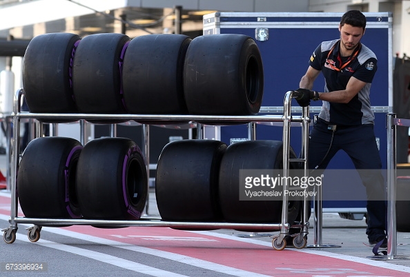 Toro Rosso mekanikerinin garaja doğru çektiği Ultra yumuşak lastikler, yazı renkleri sayesinde favorim.