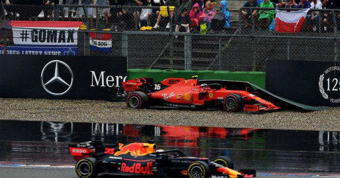 Leclerc’in olayı güvenlik aracı sırasında gerçekleşti. Ferrari takımı, Leclerc’i hemen pit’e aldı ve ona yumuşak lastikleri takarak kurumakta olan pistte avantaj kazanmasını sağlamak istedi. Leclerc’in lastikleri takıldıktan sonra pit yoluna çıkışı için onay verildiği anda, Grosjean’ın ön kanadı ile Leclerc’in arka lastikleri aynı hizadaydı. Leclerc gaza yüklendi, araba hafif bir patinajdan sonra Grosjean’ın önünde pit yoluna girdi. Tehlikeli bir şekilde, hatta hafifçe Grosjean’ın kanadını traşlayacak şekilde.