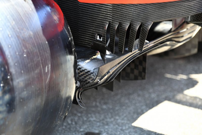 Ferrari'nin arka kanadının alt bölümüne ve Gurney uzantılı difüzör bölümüne çok yakından bakmamızı sağlayan harika bir fotoğraf.