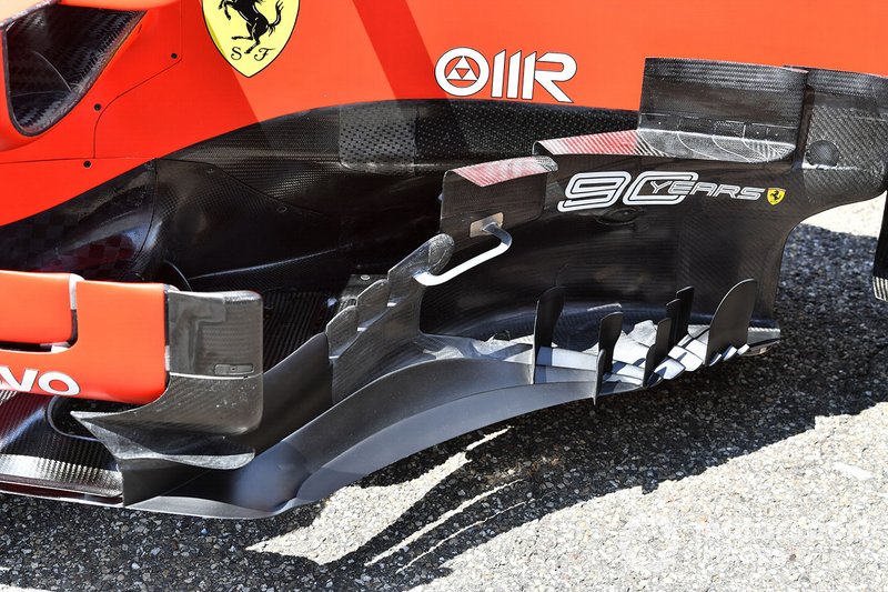 Bu resimde, aracın taban kısmının ön bölümünü çok detaylı bir şekilde görüyorsunuz. 2017'de getirilen kurallarla birlikte tabanın uç kısmı yukarıya doğru kıvrıldı. Takımların çoğu bu bölümde dikey kanatçıklar kullanıyor. Ferrari de 4 kanatçık kullanarak maksimum performans kazanmayı hedeflemiş gibi görünüyor.