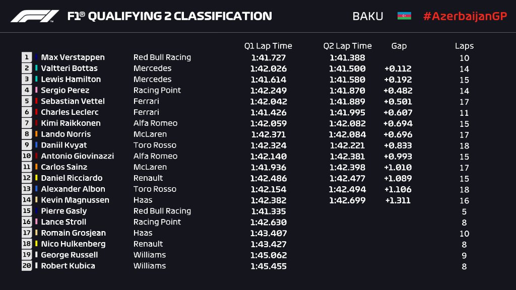 Bununla birlikte Max Verstappen, Red Bull'la 1:41.388 yapıp en hızlı isim olurken, Valtteri Bottas 1:41.500'le ikinci ve Lewis Hamilton 1:41.580'le üçüncü oldu.