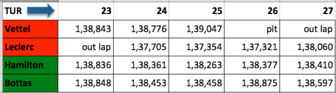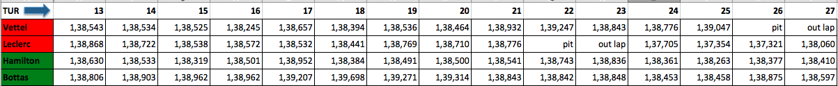 Leclerc’in pit’i ile Vettel’in arızasına kadarki bölümde atılan turlar. Leclerc’in pit’e girmesiyle Hamilton hızlanıyor. Ayrıca turları çok stabil.