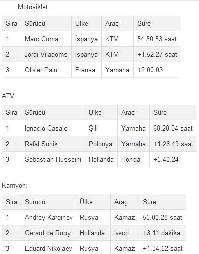 Otomobilde Nani Roma, motosiklette ise Marc Coma birinciliğe ulaşan isimler oldu. Kamyon kategorisinde Rus Andrey Karginov zirvede yer alırken, ATV araçlarında birincilik Şilili Ignacio Casale'ye gitti.