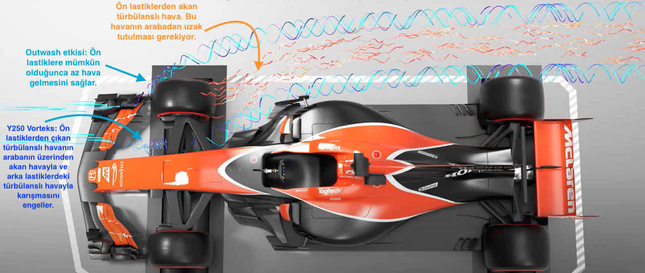 Kesiklerin yasaklanması, takımları önlem almaya zorlayacak. Takımlar, bu zorlukların kısmen etrafından dolaşmak için vorteks jeneratörlerini kullanacaklar. Burada, vorteks jeneratörlerine kısa bir parantez açalım. Yarış arabalarındaki sivri uçlar ve kanatçıklar küçük vorteksler (girdaplar) yaratır. Pek çok uçtan yaratılan girdaplar birleşerek daha büyük girdapları oluştururlar. Bu girdaplar, mühendisler tarafından yönlendirici kanatçıklarla (turning vanes) yönlendirilerek yere basma kuvveti üretmek için kullanılıyor. Aşağıdaki resimde, Formula 1 arabalarındaki en önemli vortekslerden biri olan “Y250 vorteksi”ni (lacivert yazı) görmemiz mümkün. Bu vorteks, ön tekerleklerden dağılan kirli havayla (turuncu renkli) arka tekerlekler arasına girerek türbülansın artmasını engeller.