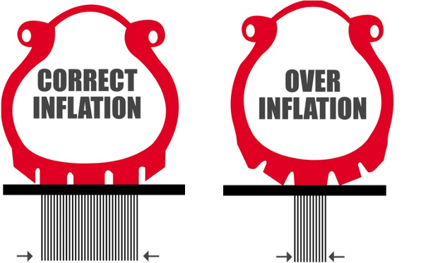 Resim x: Lastiğin fazla şişirildiği durumlarda (sağdaki resim), lastiğin zeminle temas yüzeyi azalıyor.
