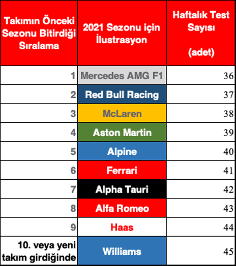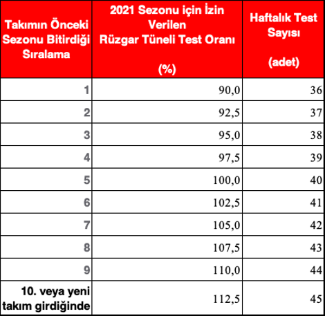 ⦁ Son olarak puan sıralamasında geride kalan takımlara fırsat eşitliği doğuracak bir kural devreye alındı. Bu kural sayesinde küçük takımlar, rüzgâr tünelinde büyük takımlara oranla daha çok zamana sahip olacak. Haftada 40 defa üzerinden baz alınan rüzgâr tüneli test sayısı, takımın başarısına göre değişecek. Tablo aşağıda: