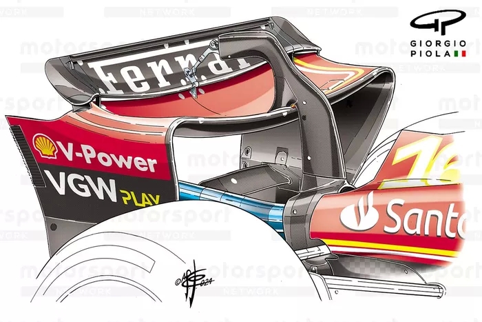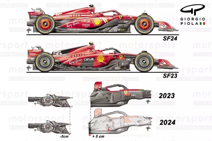 SF-24 de tamamen yeni bir araç. Bu yüzden, kırmızı otomobilin sezon boyunca bir miktar büyüme kapasitesine sahip olamayacağını söylemek doğru olmaz. Kokpitin konumu değişmemiş olsa da, Ferrari SF-23'ten çok farklı bir düzene sahip, şasi tamamen yeni, sürücünün arkasında yaklaşık 50 mm daha uzun olmasının yanı sıra, aynı zamanda daha dar ve geçen yılki araca kıyasla ağırlık tasarrufu sağlıyor.