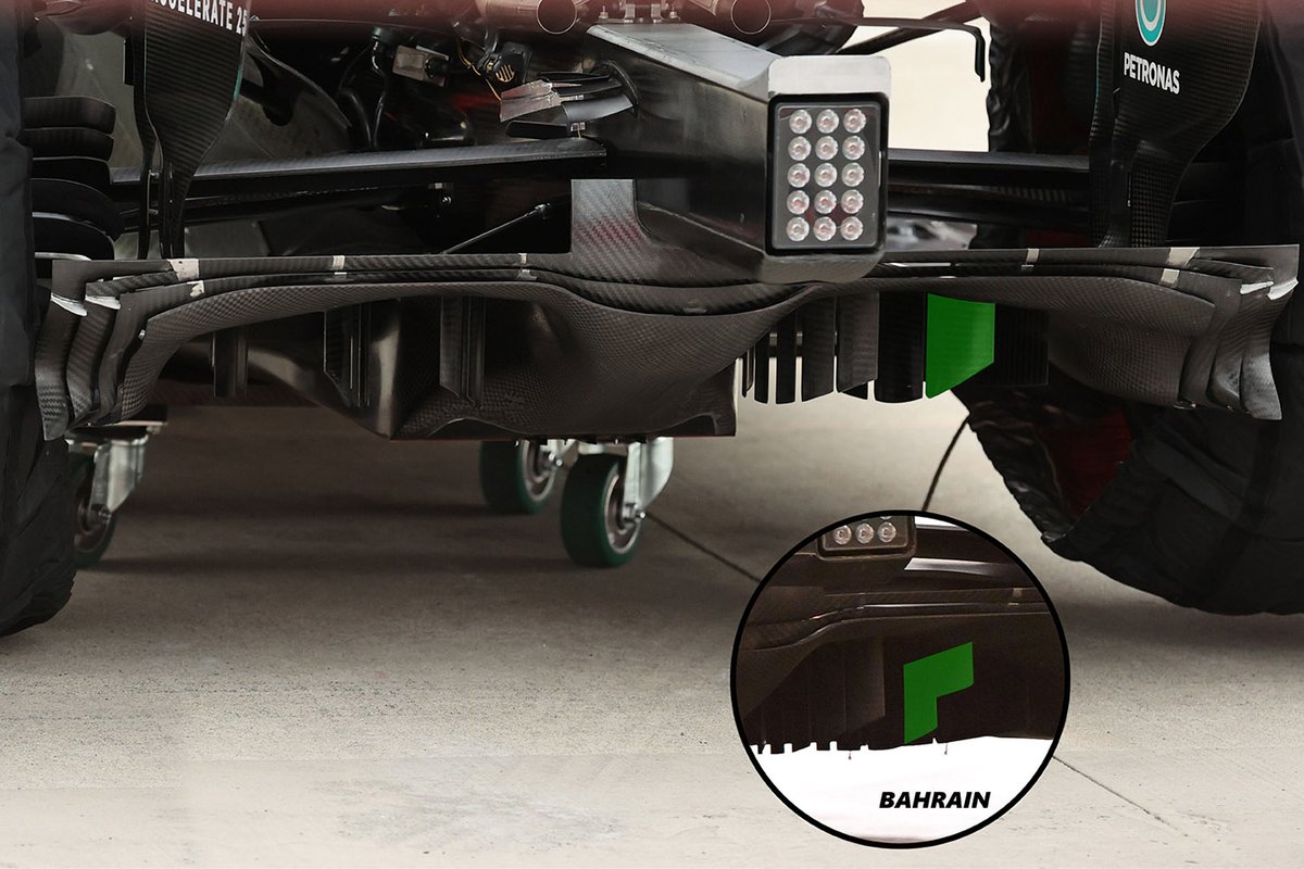 Ancak Imola yarışında Mercedes yeşil renk ile gösterilen ikinci sarkıt kanadı değiştirdi. Bahreyn yarışında L şeklinde bir tasarım varken, Imola'da düz bir tasarım kullanıldı.