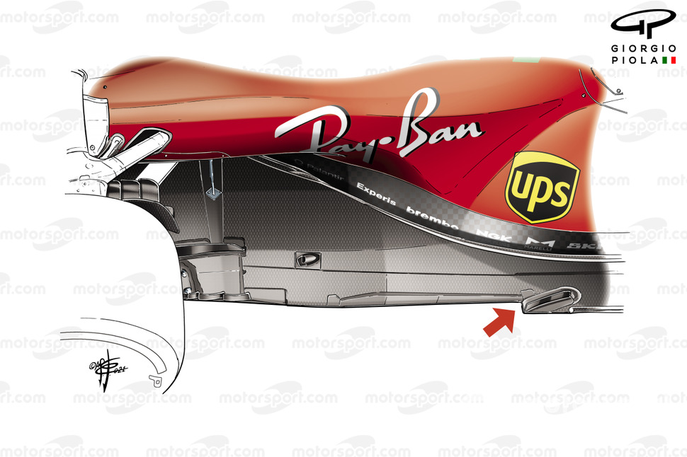 Ferrari, Z şeklinde kesikli tabana geçmesinin ardından bölgedeki 3 kanatçığı, en azından kısa vadede, kaldırmış durumda. Ancak Z şeklinin verildiği bölgeye kırmızı ok ile gösterilen büyük kaplama eklenmiş.