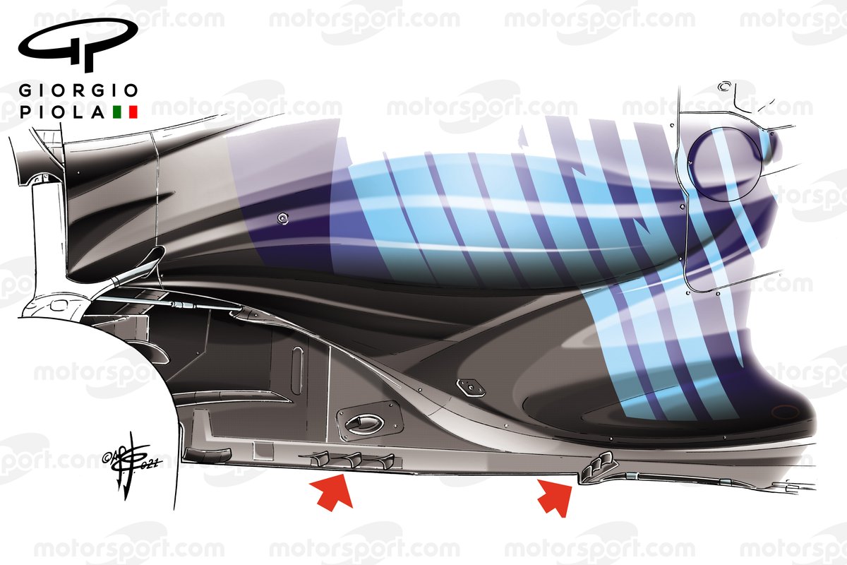 Tabanın sidepodun yanına denk gelen kısmına eklenen kanatlar ve kanatçıklarla, geçen sene o bölümde yer alan ancak bu sene yasaklanan kanallardan kaybedilen performansın telafi edilmesi hedefleniyor.
