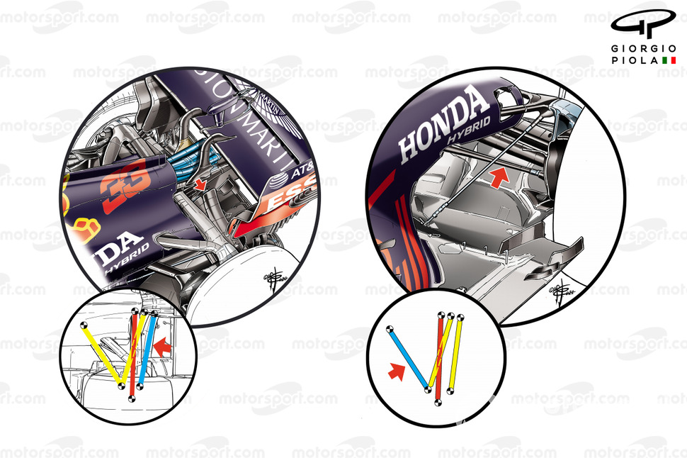 Red Bull, 2019'da aşağıdaki resimde solda yer alan çizimde ön süspansiyon sisteminin üst kolunda çoklu bağlantıyı kullanmaya başlamıştı.