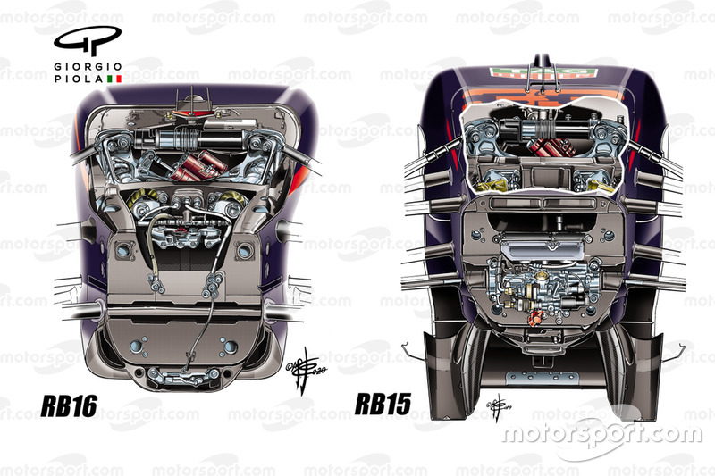 RB15 ile kıyaslandığında RB16'nın kremayerinin, ön bölmede çok daha geriye yerleştirilmiş olduğu görülüyor.