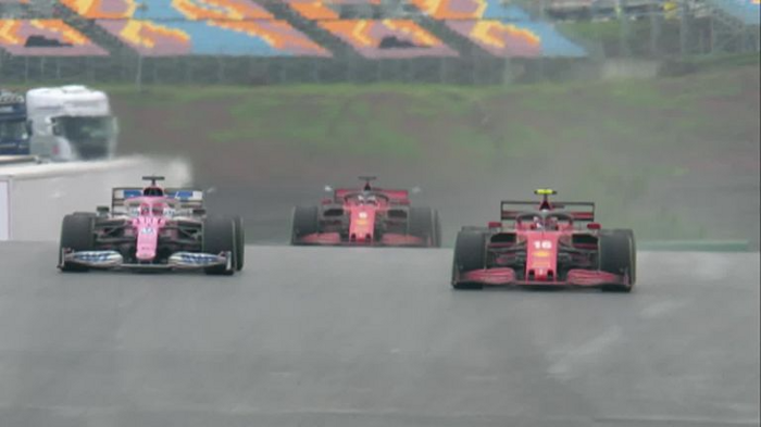 Leclerc’in DRS’si açık ve önde. Perez yerini geri almak için savaşıyor. Vettel en arkada olanları izliyor. Leclerc ideal çizginin dışında. Pist, eskisi kadar ıslak olmasa da o bölgenin kaygan olduğunu Leclerc saniyeler içinde öğrenecek.