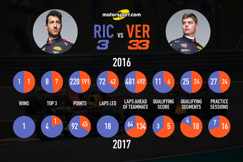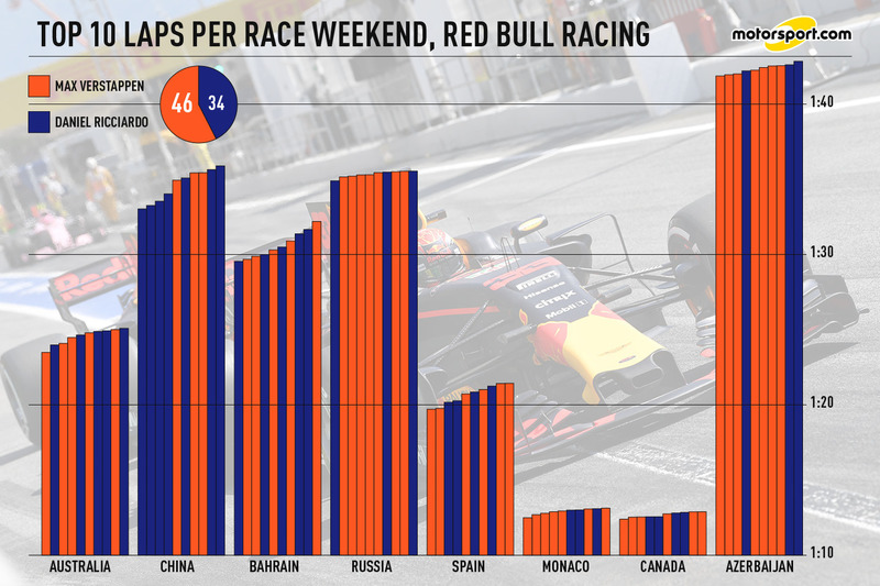 Ancak Rusya'dan beri Verstappen, 12 sıralama seansının hepsinde Ricciardo'dan hızlı oldu. Antrenmanlarda ise 12 antrenmanın 2'si hariç hep önde yer aldı. Bu sonuçların çoğu temsil edici olmayabilir ve Ricciardo için Monaco'daki 3. seanstaki trafik ve Kanada'da 2. antrenman seansındaki sorunun geri kalan seansları etkilemesi gibi durumlar söz konusu oldu. Ancak yine de, tüm resmi göz artı etmemek lazım.