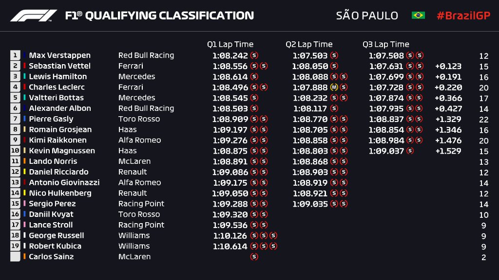 2019 Formula 1 sezonunun 20. yarışı olan Brezilya GP öncesi gerçekleştirilen sıralama turlarında pole pozisyonu Red Bull pilotu Max Verstappen'in oldu.