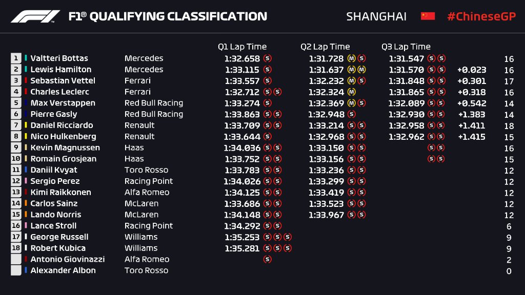Bottas son zaman turunda 1:31.547 yaptı ve pole pozisyonunun sahibi olmayı başardı. Hamilton, son turunda yavaş kalınca 0.023 saniye geride ikinci oldu.