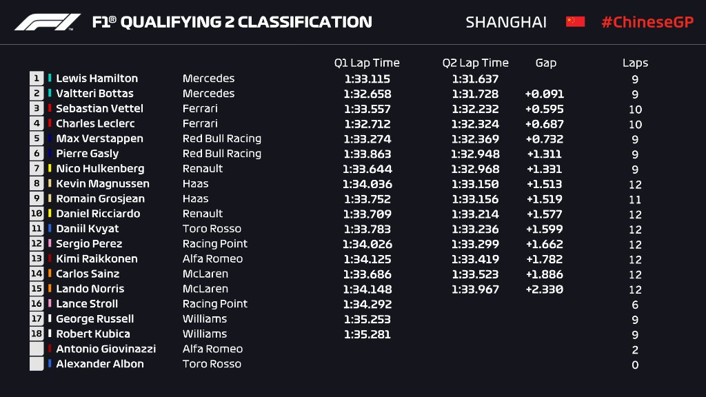 Toro Rosso pilotu Daniil Kvyat son bölüme kalmayı ufak bir farkla kaçırıp 11. olurken, Sergio Perez, Kimi Raikkonen, Carlos Sainz Jr ve Lando Norris ikinci bölümde elendiler.