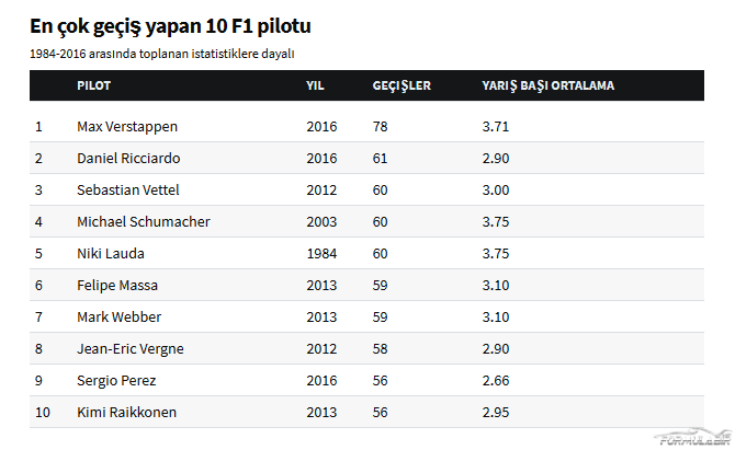 Eğer tablo yarış başına ortalama üzerine kurulu olsaydı Lauda ve Schumacher rekoru yarış başına 3.75 geçiş ile paylaşırken, Verstappen 3.71 ile üçüncülüğe düşerdi.