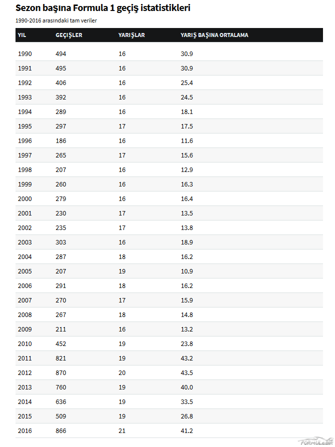 DRS ve Pirelli’nin yüksek aşınma oranlarına sahip lastikleri ortaya çıktığında ise geçiş sayıları devasa şekilde artış gösterdi.