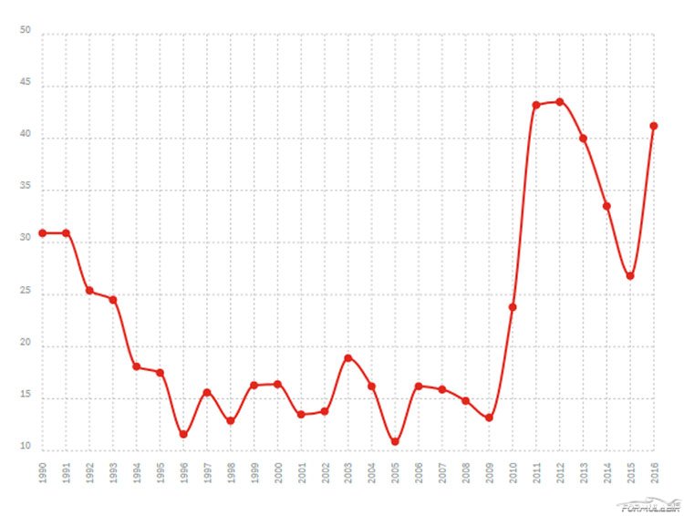 Formula 1’in kural koyucuları 2003’te sıralama turları biçimini değiştirdiğinde rakamlar yükselmeye başladı, ancak yine de düşük kaldı.