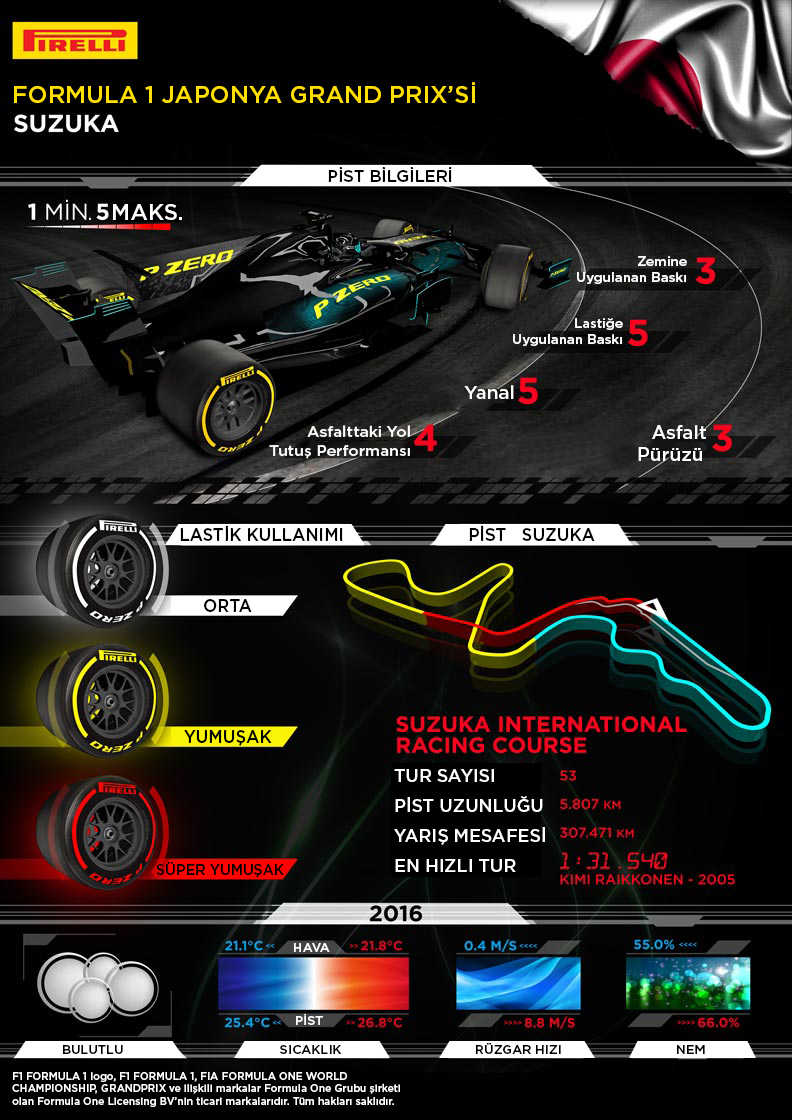 Japonya'da gerçekleştirilecek Formula 1 sezonunun on altıncı yarışı öncesinde Pirelli pilotların kullanacağı lastikleri açıkladı.