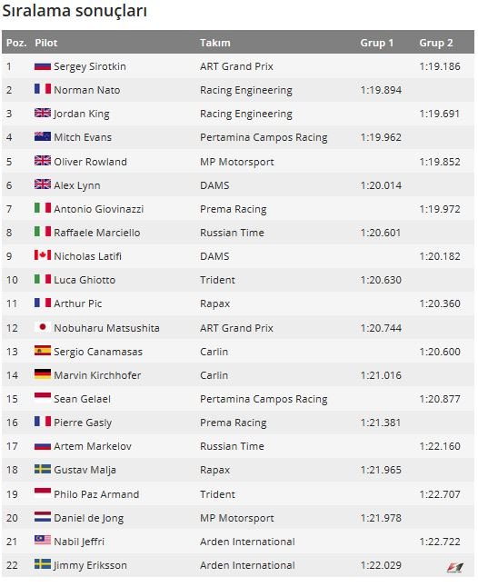Sirotkin'in, vatandaşı Artem Markelov ile çapışıp, bariyerlerin onarıldığı olaydan bir tur sonra attığı tur ikinci grubun en hızlısı olmaya yetti. Birinci grup ise Norman Nato'nun liderliğinde sonlandı.