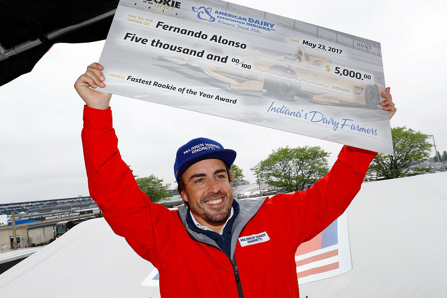 Ödülünü Indy efsanesi ve eski McLaren pilotu Johnny Rutherford'un elinden alan Alonso 5,000 $ para ödülü, plaket ve hatıra posteri kazanmış oldu.
