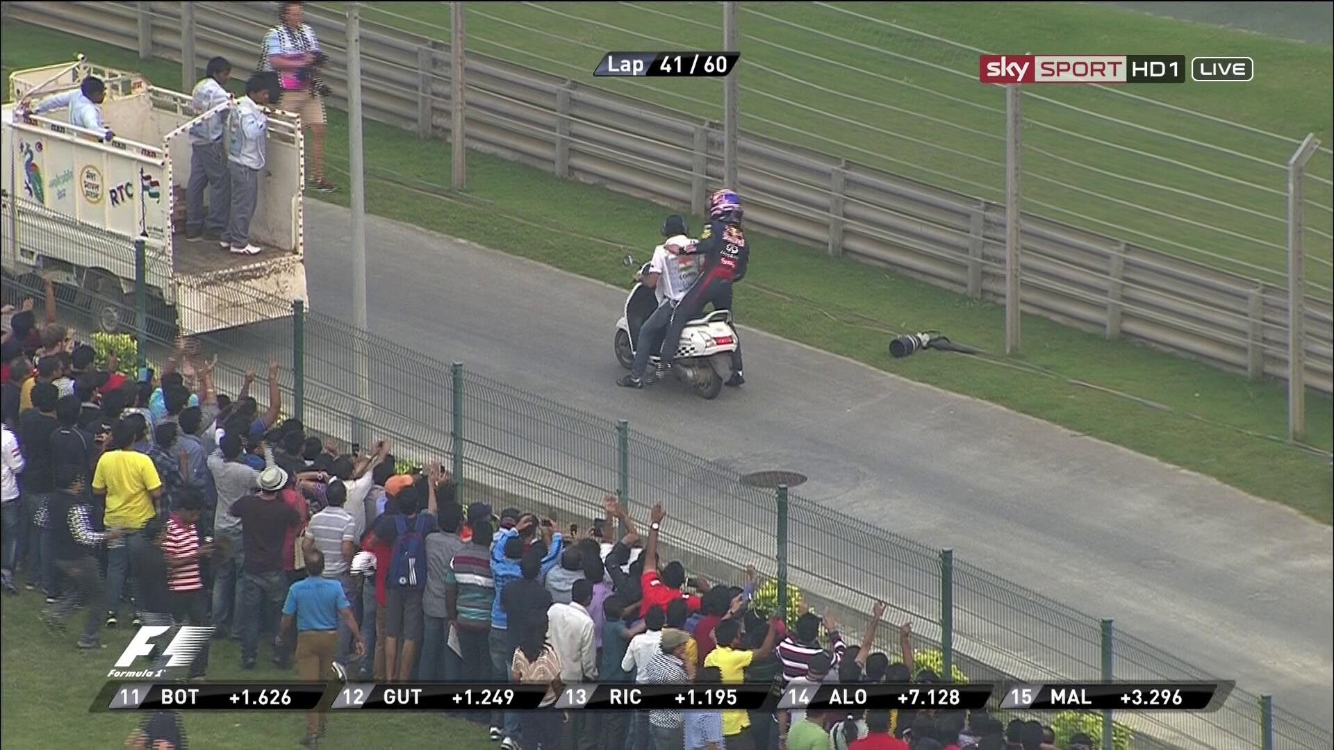 Şimdi Vettel lider, Raikkonen 2., Sutil 3. sırada. Hayranlar Webber'in bulunduğu bölüme koşuyorlar. Webber onları selamlıyor.