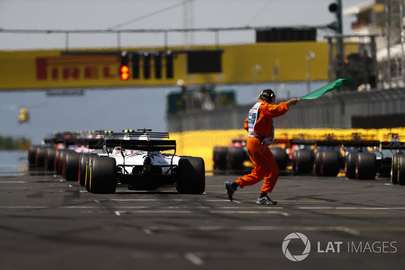 Işıklar yanar ve bir hakem başlangıcı için yeşil bayrak sallar