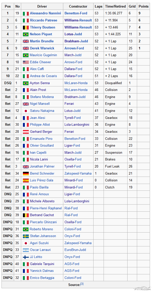 Senna yarıştan hemen sonra yarış hakemleri tarafından diskalifiye edildi. Sebep olarak da Prost ile olan kazasından sonra şikanı geçmeden piste dönmesi gösterildi. Senna kararın sebebinin FISA başkanı Jean-Marie Balestre’nin şampiyonluğu hemşerisi Prost’a vermek istemesi olarak yorumladı. Ancak yarış hakemleri ve Balestre bunun doğru olmadığı, kararın verildiği zaman toplantıda kendisinin bulunmadığını açıkladı. Yarış zaferi Nannini’ye giderken, Patrese ve Boutsen podyum seramonisine katıldılar. Bu sonuç Alessandro Nannini’nin tek Formula 1 zaferiydi.
