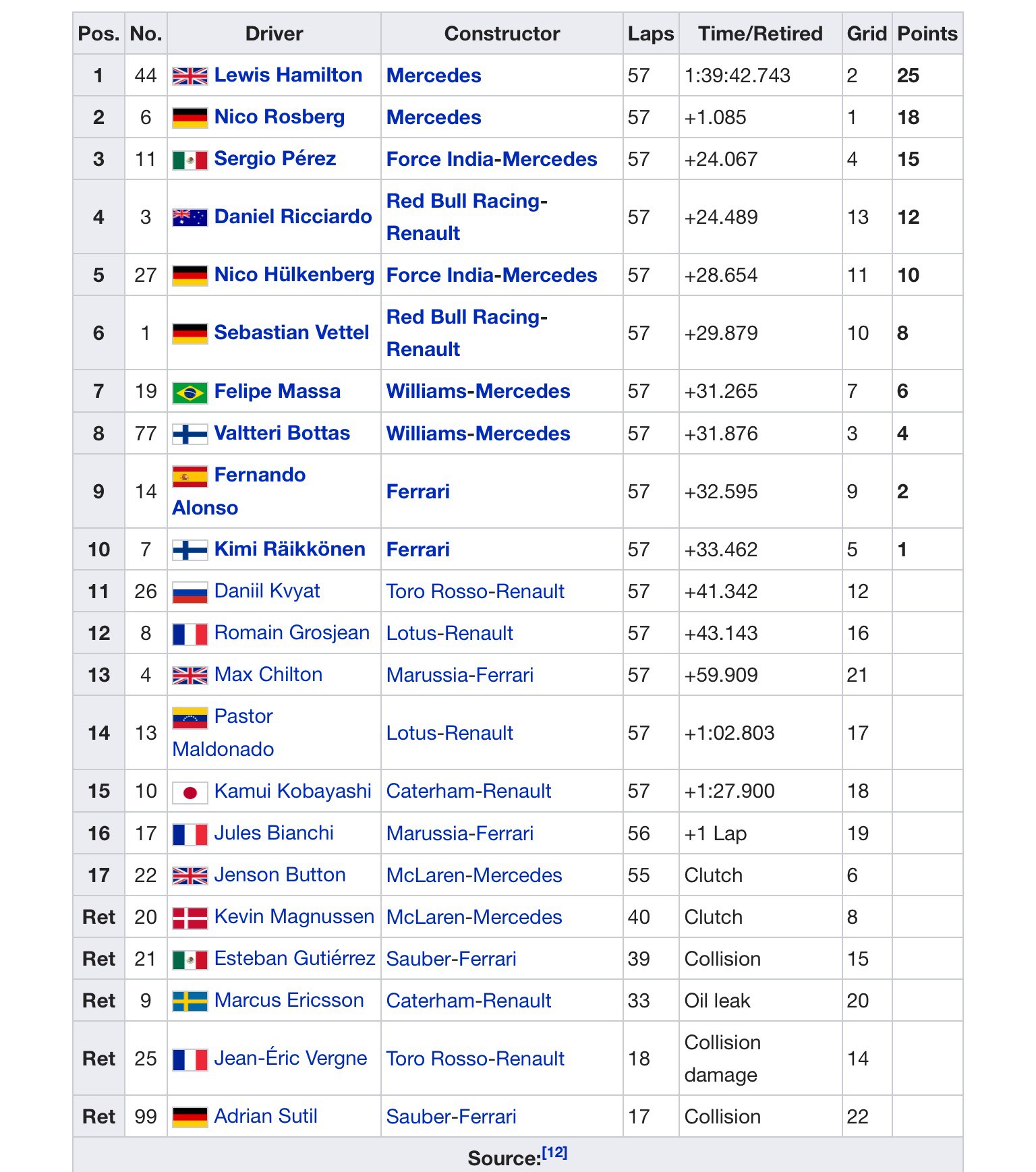 Sıralamalarda Hamiton’a oranla daha iyi bir tur atan Rosberg pol pozisyonunu kaptı. İkinci çizgiye yerleşerek şaşırtan Perez ve Bottas’ı Raikkonen Button, Massa, Hulkenberg ve Alonso takip etti. Aslında 3. olan Ricciardo’nun Malezya’da başlayan şanssızlıklar silsilesi bu yarışın sıralama turlarında da devam etti. Vettel ise son bölüme kalamadı.