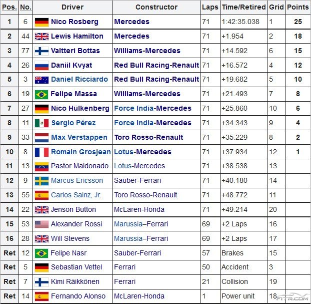 58. turda güvenlik aracı pistten çıktı ve Bottas ilk virajda Kvyat’a atak yaparak üçüncülüğü ele geçirdi. Yarışın son turlarında Hamilton Rosberg’e yaklaşsa da geçmeyi başaramayınca galibiyet Alman pilotun oldu. Podyumu tamamlayan isimler de Hamilton ve Bottas oldular.