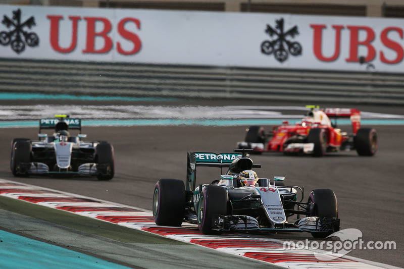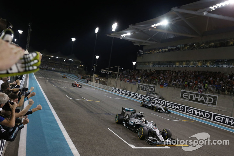 Yarış galibi Lewis Hamilton, Mercedes AMG F1 W07 Hybrid, İkinci sıra ve Dünya Şampiyonu Nico Rosberg, Mercedes AMG F1 W07