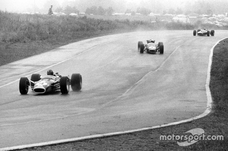 Graham Hill, Lotus 49-Ford, ve Jack Brabham, Brabham BT24-Repco, ve Jackie Stewart, BRM P83