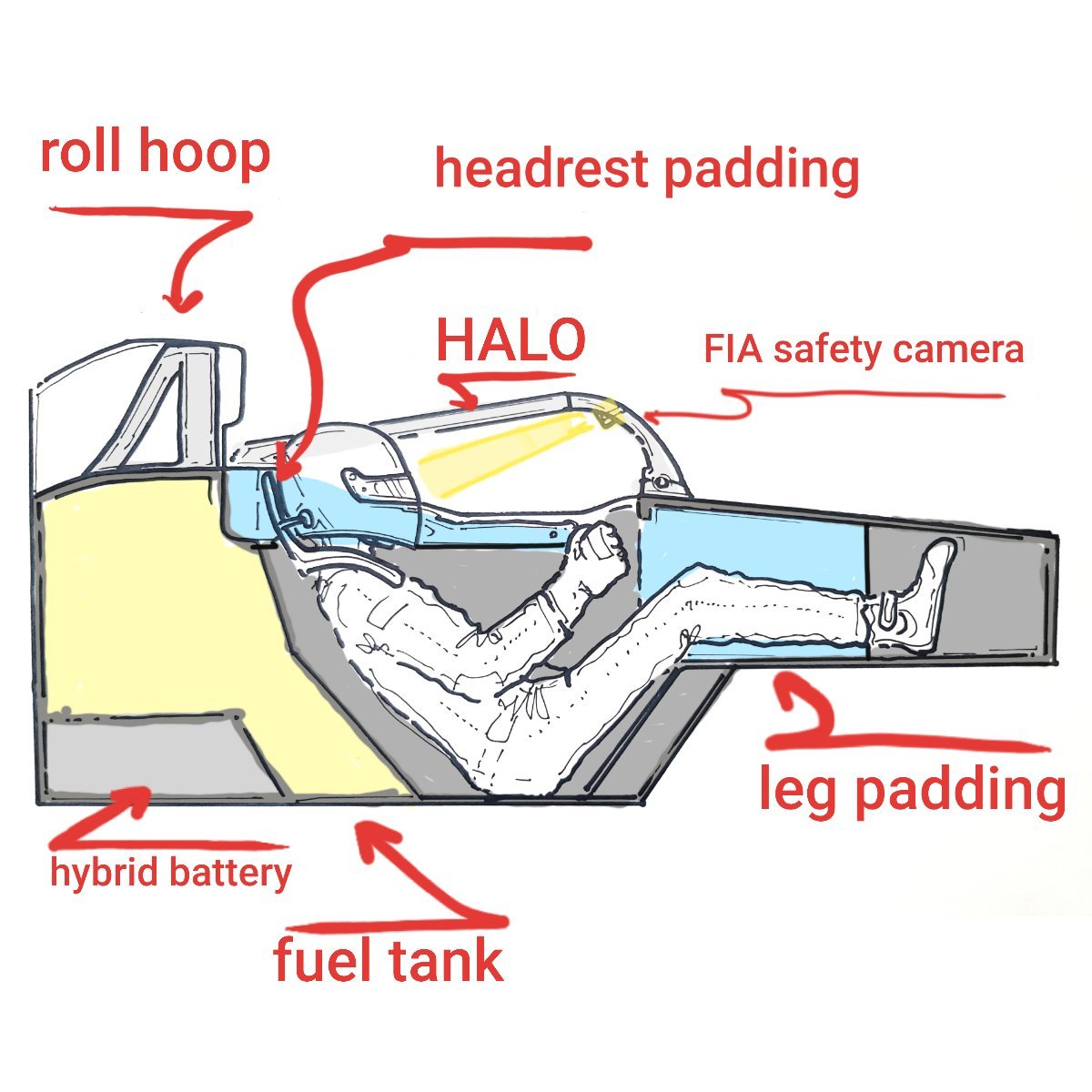 Yakıt tankı pilotun hemen altında ve bataryaların üzerinde bulunuyor. Halonun içerisinde FIA'nın kameraları bulunuyor. Pilotun kafasının arkasında başını dayayabileceği bir alan ile takla barı var.