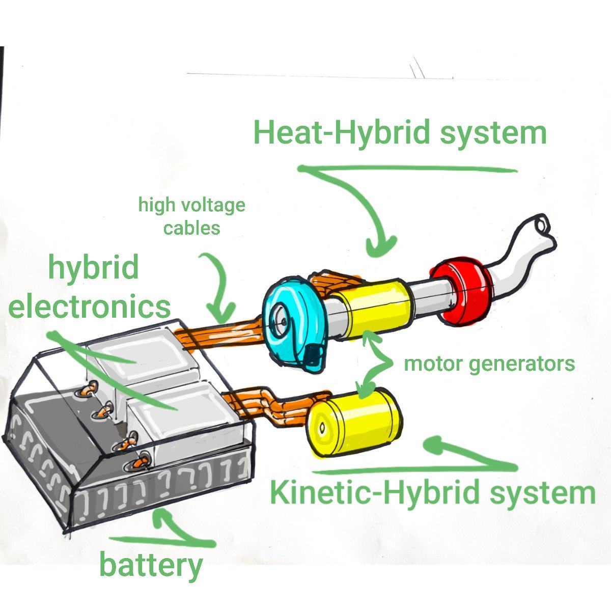 Hibrit sistemde ise parçalar bu şekilde. İki tane jeneratör ünitesi atık gazlardan ve frenlemeden elde edilen enerjiyi elektrik enerjisine çevirip pillere gönderiyor. Pillerde depolanan bu enerji sayesinde F1'de motorların verimliliği %50'nin üzerine çıktı.