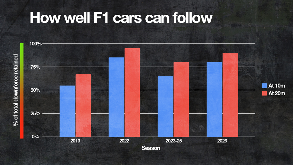 2022’de, yeni kuralların ilk yılında, takip etmek gerçekten daha kolaydı. FIA’nın yeni kurallara temel oluşturan analizine göre, 2019’da bir araç, önündeki rakibinin 10 metre arkasında kaldığında yere basma kuvvetinin yüzde 55’ini kaybediyordu. 20 metrede ise bu oran yüzde 65’ti.
