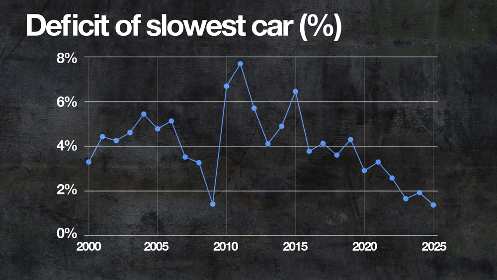 Ancak tablo bundan biraz daha karmaşık. Bu kurallar, rekabetin aradaki farkını ciddi şekilde azalttı. 2025’te en yavaş takım olan Alpine’in tek turda en hızlı takıma olan performans farkı sadece yüzde 1,369 oldu. Bu, 21. yüzyılın en düşük seviyesi ve yalnızca 2009 yılı bu seviyeye yaklaşabildi.