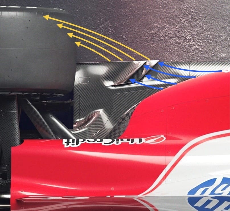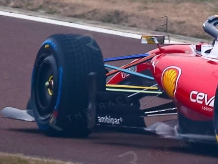 Akışın arkaya doğru ilerlemesiyle birlikte, bir kısmı tabanın dış kenarına yöneliyor. Buradaki küçük louver’lar, lastik yere temas ettiğinde oluşan ve “lastik sıçraması” (tyre squirt) olarak adlandırılan yüksek enerjili hava akışını tabanla birleştirmeye çalışıyor. Bazı takımlar, üst taban akışını lastik sıçramasıyla lastiğin iç kısmında birleştirirken, Ferrari bu akışı lastiğin dışına yönlendirmeye odaklanmış görünüyor. Bu alanda sezon boyunca çeşitli gelişmelerin yaşanması bekleniyor.
