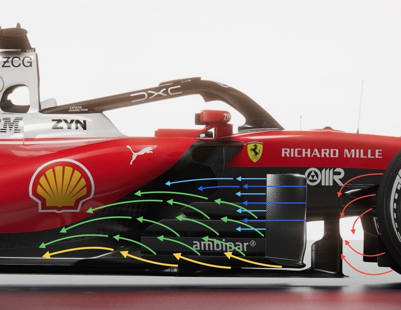 Bargeboard bölgesinde, her takımın benzer aerodinamik sorunlara farklı çözümler getirdiği görülüyor. Ön lastiğin arkasında oluşan türbülans nedeniyle, bu bölgede hava akışının düzenlenmesi kritik önem taşıyor. Eğer bu türbülans doğrudan tabana yönlendirilirse, tabandan elde edilen yere basma kuvvetinde ciddi kayıplar yaşanabiliyor. Ferrari’nin bargeboard tasarımı, akışı düzenleyerek düşük basınçlı “Coke bottle” bölgesine yönlendirmeyi amaçlıyor. Bu akış, yan kutu ön kenarındaki alt kesitten başlıyor.