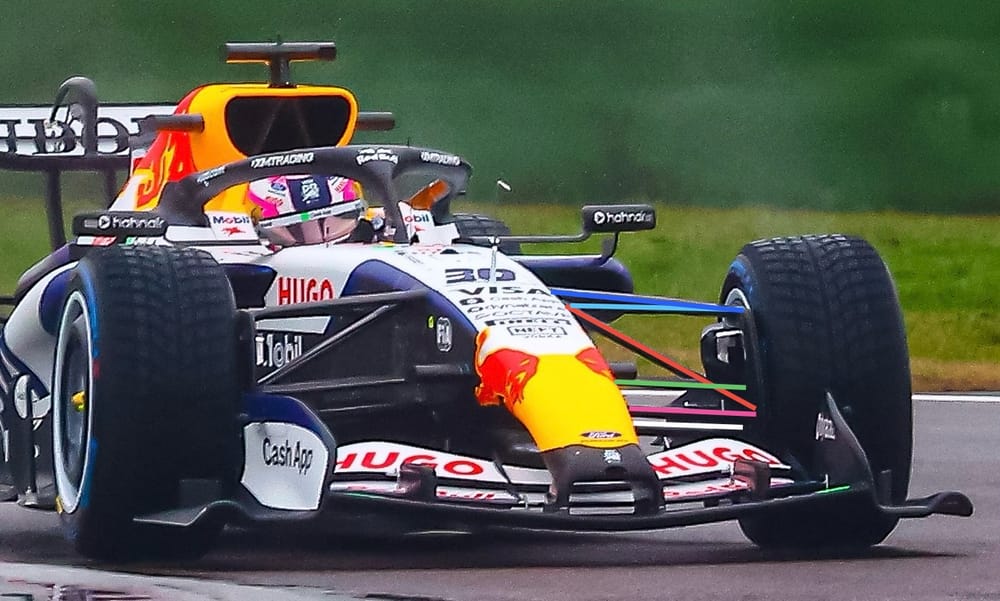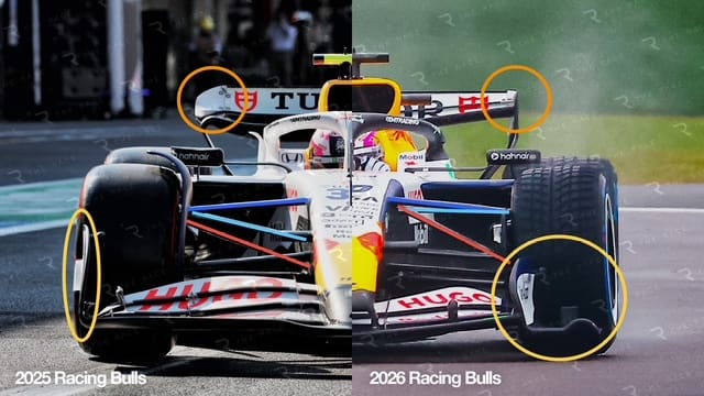 2025 ve 2026 Racing Bulls araçlarının ön süspansiyonları karşılaştırıldığında, anti-dive açısının azaldığı ve pullrod’dan pushrod’a geçiş yapıldığı görülüyor. Ön kanat uç plakaları ise daha içe alınmış durumda. Alt tablanın ise darbelere karşı hassas olduğu ve bu sezon çarpışmalar sonrası bazı parçaların havada uçuşabileceği öngörülüyor. Yeni ön kanat, üç elemanlı bir yapıya sahip ve ana kanat profiliyle birlikte flap yüksekliği azaltılmış. Ayrıca, slot aralığı sayısı da ikiye düşürülmüş durumda, bu da takımların daha düşük flap açısıyla çalışmasını gerektiriyor.