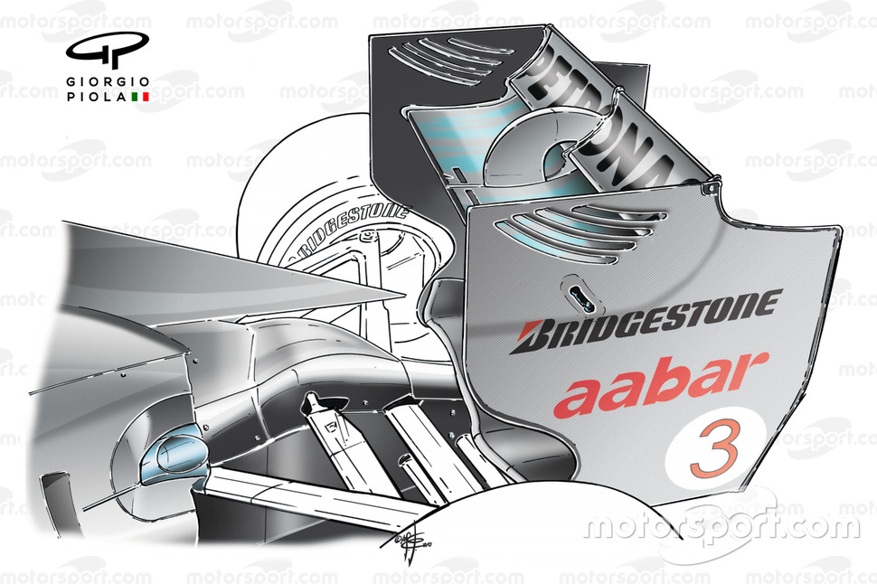 Ancak pilot 2 numaralı deliği kapadığında, 1 numaralı kanaldan giren hava sidepod üstünde yer alan 3 numaralı kanaldan motor kapağı bölgesine ilerliyor, 5 numaralı akışkan hava odasından 6 numaralı üst kanala geçiş yapıyor. Bu işlemde aynı zamanda 4 numaralı üst hava girişinden giren hava da üst kanala yönlendiriliyordu. O dönemde köpek balığı yüzgeci şeklindeki motor kapağı arka kanada kadar uzuyordu. Bu bölümdeki ekstra hava kanalı, arka kanadın normal şeklinde çalışmasını yani yere basma gücü üretmesini durduruyor, hava akımının doğrudan kanadın alt ve üst parçaları arasından çıkmasını sağlıyordu.