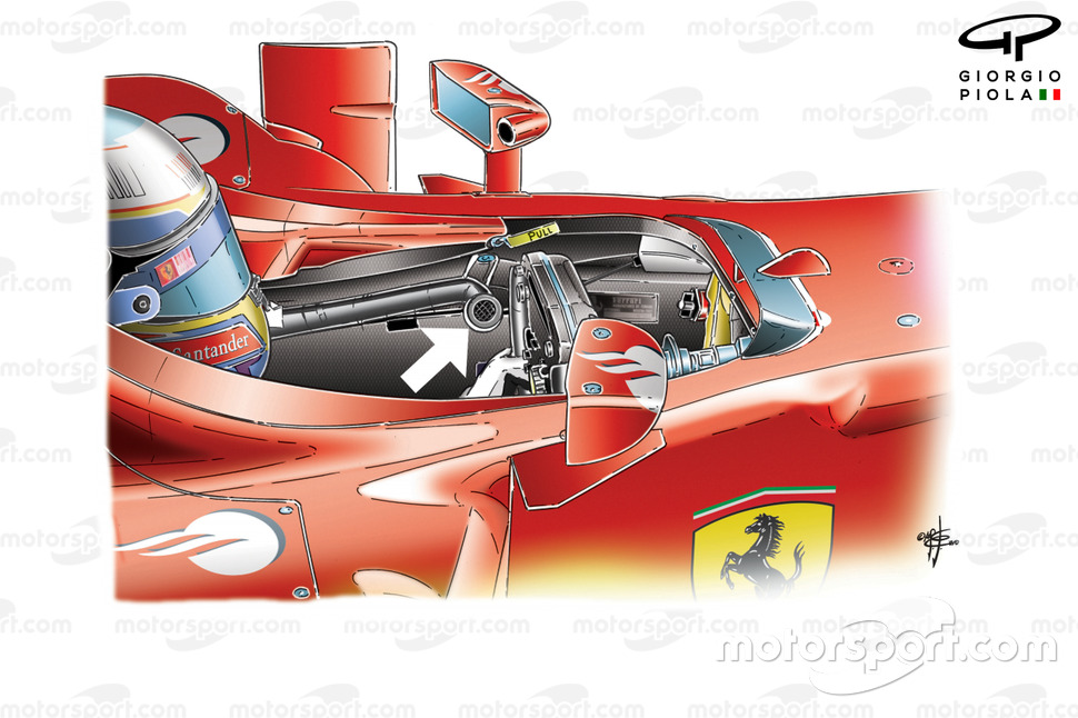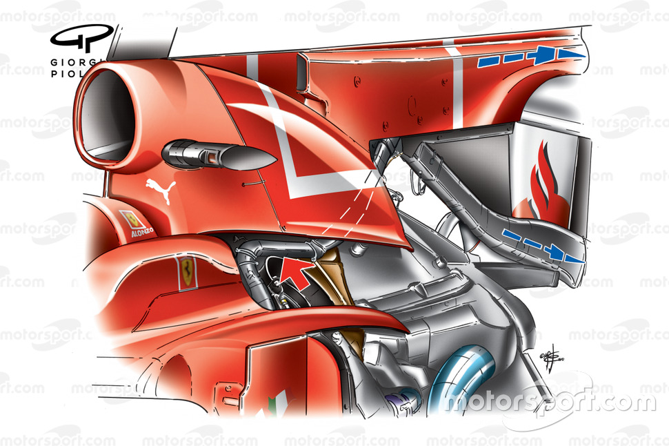 Ferrari, motor bölgesindeki hava kanalları motora yeteri kadar hava girmeye yardımcı olacak şekilde optimize edildiği için, sistemi çalıştırabilmek adına bu bölgede ekstra hava girişleri kullandı.