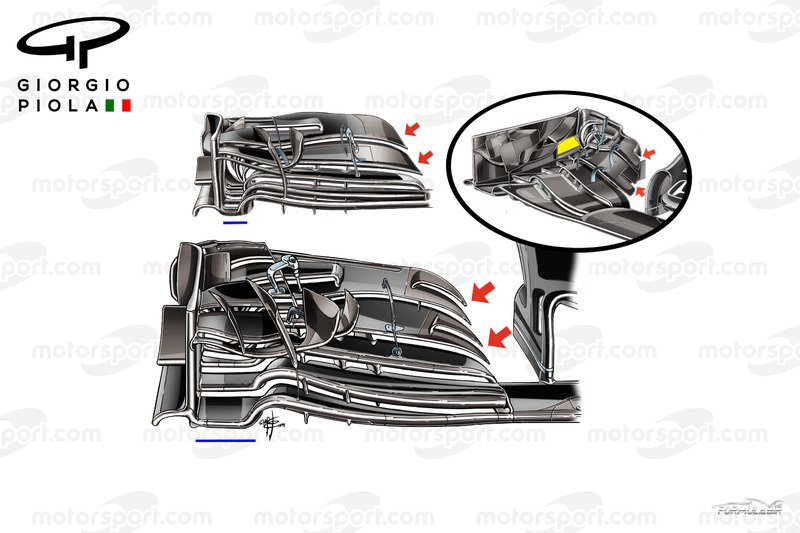 Bunun yanında ön kanat kenarının iç tarafında yer alan tünelin yanındaki alanın genişlediği görülüyor (Mavi çizgi). Bu sayede ana flaplerin altına giren havanın lastiklere geçmeden önceki yapısı değiştirilmiş oluyor.