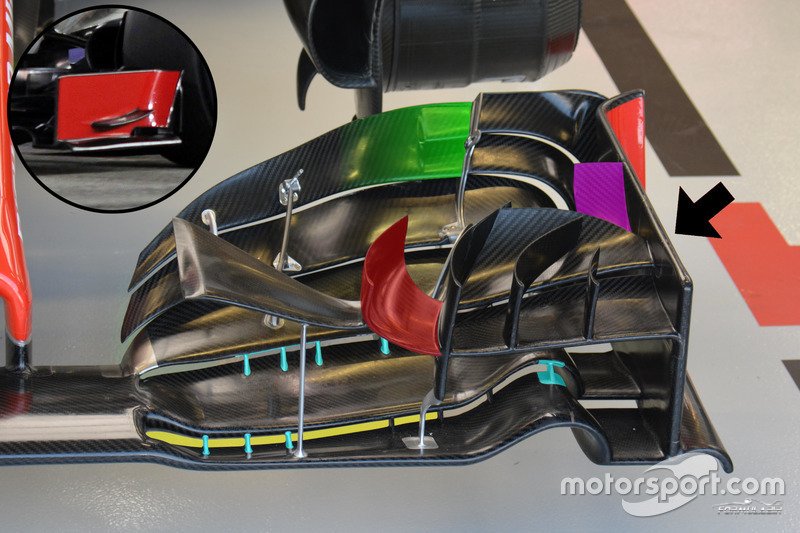 Yeni ön kanatta sarı ile gösterilen tam boyutlu bir yarık bulunuyor. Ön kanattaki yarıklar arasında, yarıkların yüksek güçte sabit durması için dikey sabitleyiciler bulunuyor. Bunların hava akımında istikrarsızlığa sebep olabileceği düşünülüyor. Ancak parçanın aynı zamanda o bölgeye pistten gelen çeşitli kalıntıların takılmasını engellemesi bekleniyor.