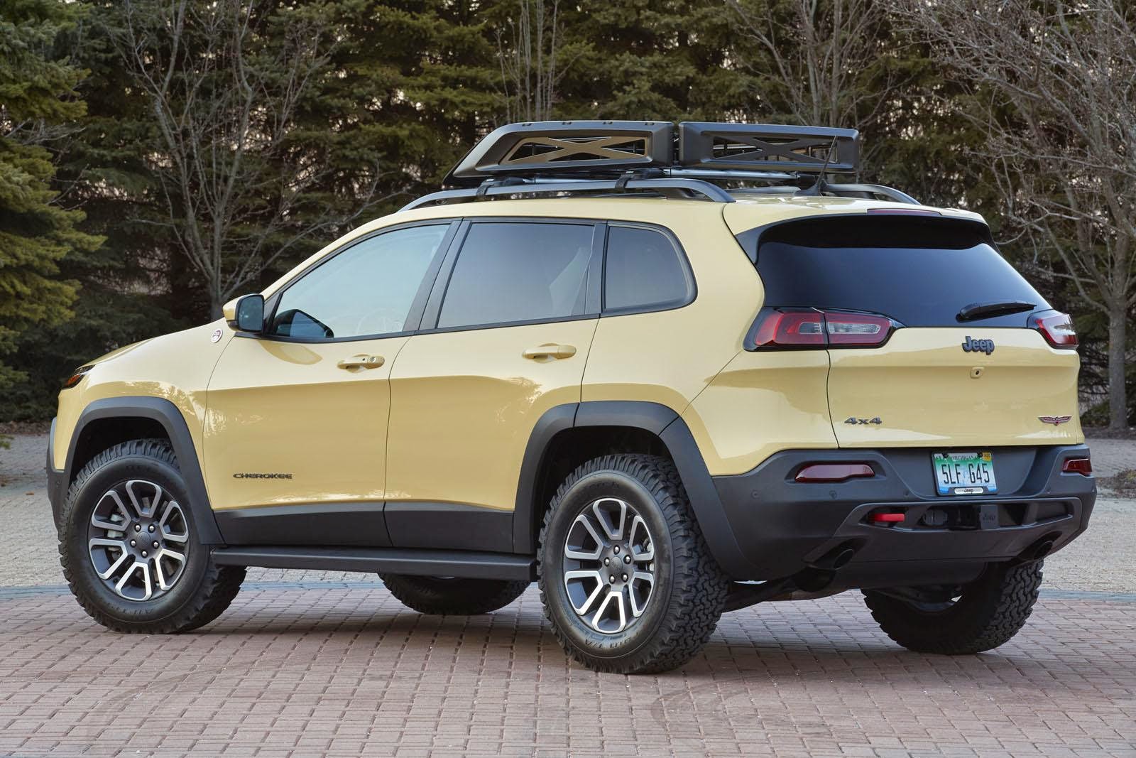 Cherokee Dakar konseptinde genişletilmiş çamurluklara yer veren Jeep yeniden tasarladığı ön tamponda sis farlarına yer vermemiş. 17 inç çaplı jantlarının büyük kısmı siyah olsa da ön panjur ve cam çerçevelerinde olduğu gibi bir kısmı kırmızıya boyanan aracın marşpiyeleri de yenilenmiş. Yükseltilen süspansiyon sistemi, büyüyen lastikleri ve incelen arka tamponuyla araziye daha uygun hale gelen konseptin arkasına bir de treyler çekme aparatı eklenmiş.