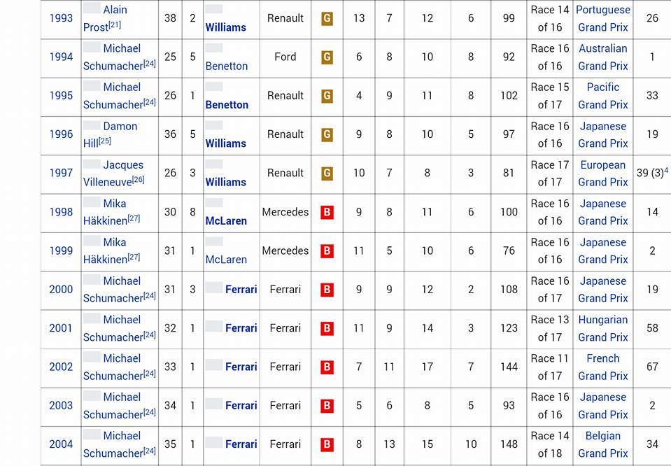 Üst üste şampiyonluk sayısında, ilk sırada 5 yıl üst üste şampiyon olan Michael Schumacher geliyor.